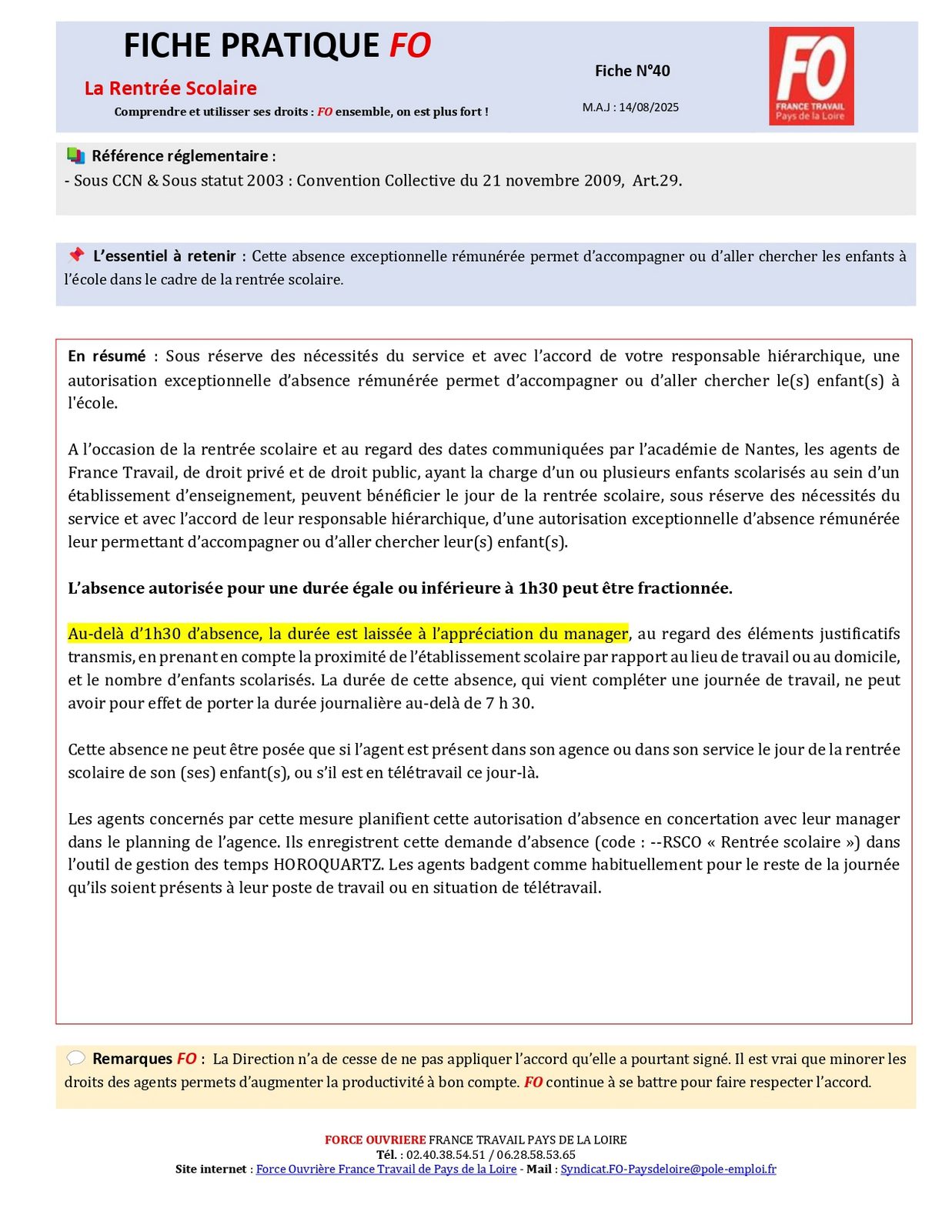 Autorisation d'absence rémunérée Rentrée Scolaire